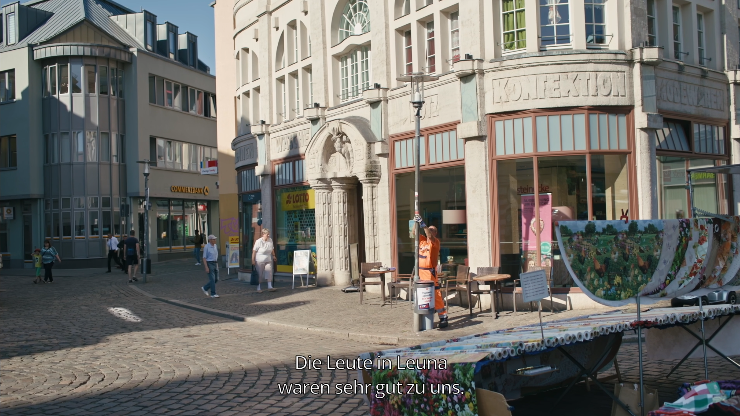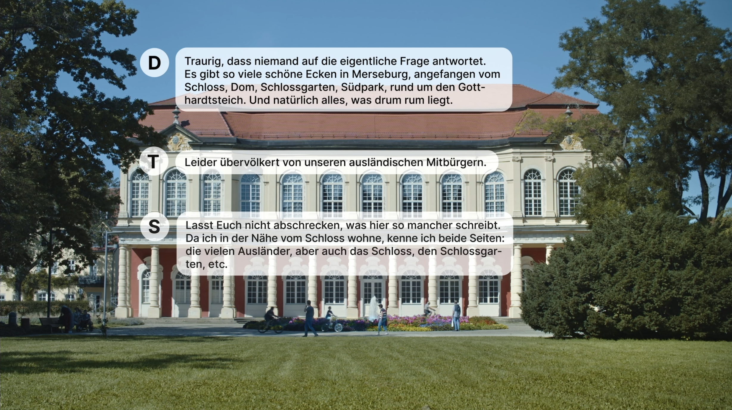 Während eines Stadtrundgangs durch Merseburg werden auf der Tonebene Textfragmente gegenübergestellt: Erinnerungen von ehemaligen Vertragsarbeitern verbinden sich mit weiteren Stimmen aus Merseburg, Auszüge aus Stasi-Akten und Zeitungsartikeln kontrastieren mit Straßeninterviews und Facebookkommentaren. Mit dieser dichten Collage reflektiert der Film über Erinnerung, Verdrängung und rassistische Kontinuitäten.